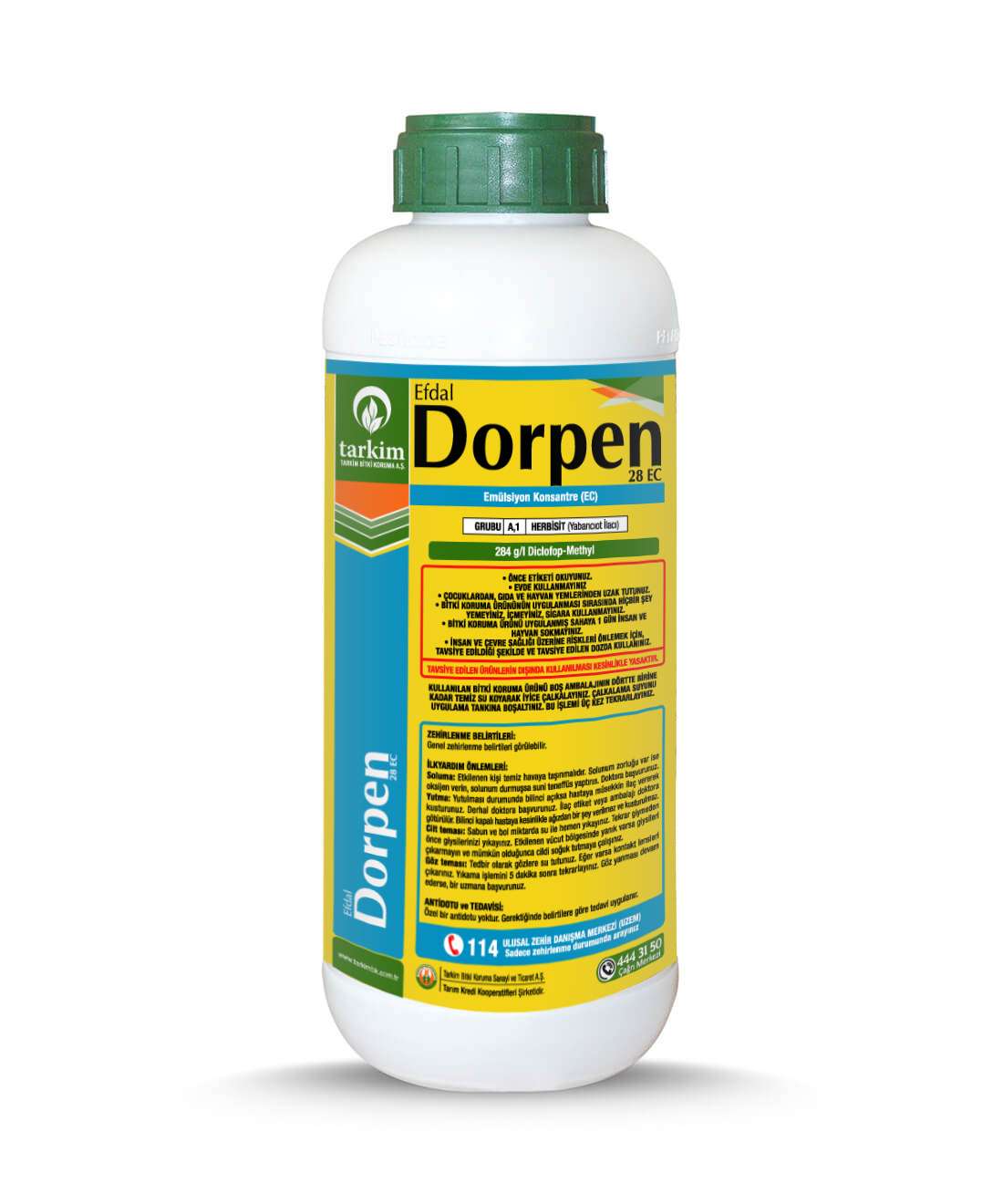USAGE: EFDAL DORPEN 28 EC is a systemic pesticide that acts on weeds from the leaves. When applied in the 2-4 leaf stages of weeds, the best effect is obtained. It is not applied in very dry weather where the temperature is above 30˚C. It is not used in corn, cotton, rice. It is applied with any tool except motorized backpack atomizer. Its effect depends on weather conditions and becomes apparent 3-7 days after spraying. If it rains 2 hours after spraying, it is not necessary to repeat the spraying.